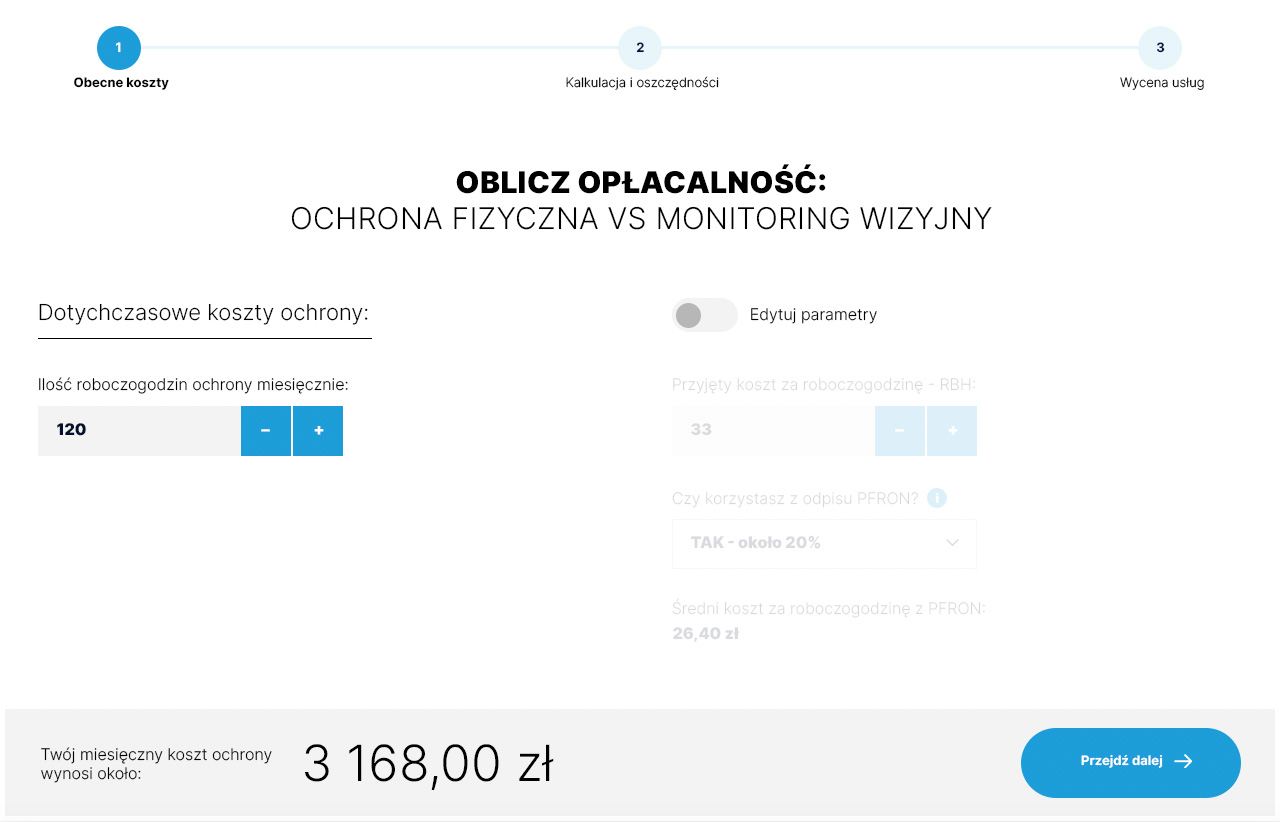 To narzędzie jest przydatne dla osób zainteresowanych przechodzeniem z tradycyjnej ochrony fizycznej na system monitoringu wizyjnego. Dzięki temu narzędziu można w łatwy sposób uzyskać informacje na temat różnicy w kosztach oraz oszczędności, wynikających z przejścia na monitoring wizyjny, oraz szacowaną sumę oszczędności w określonym okresie czasu.