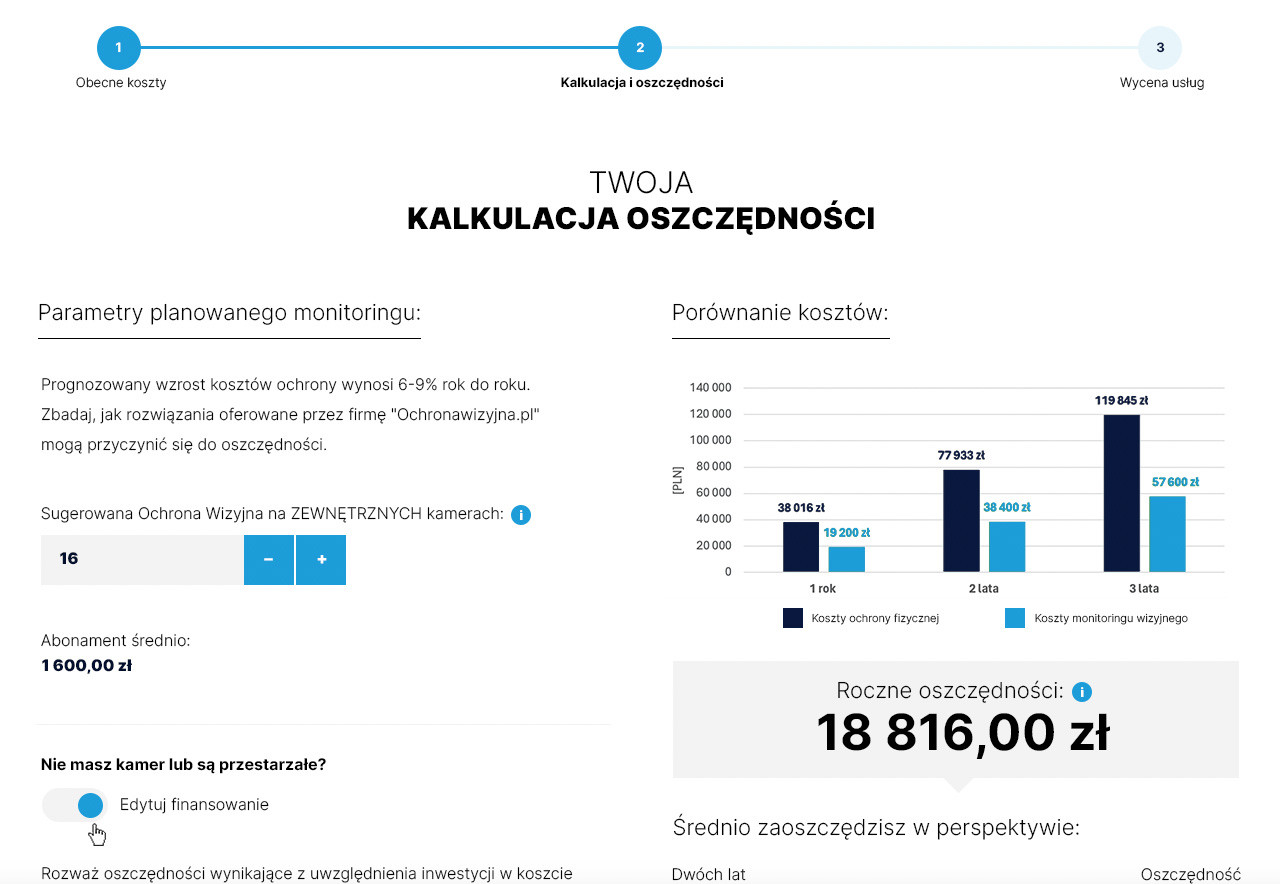 Następnie zostaniemy przekierowani do formularza, który sugeruje rozwiązanie dla szacunkowej liczby zewnętrznych kamer. Możemy wypełnić go szczegółowo, aby uzyskać wstępną kalkulację, wykres oszczędności oraz przybliżoną wycenę przyszłego abonamentu. Po kliknięciu trybu edycji, wycena może dodatkowo uwzględniać finansowanie sprzętu w ramach miesięcznych opłat.