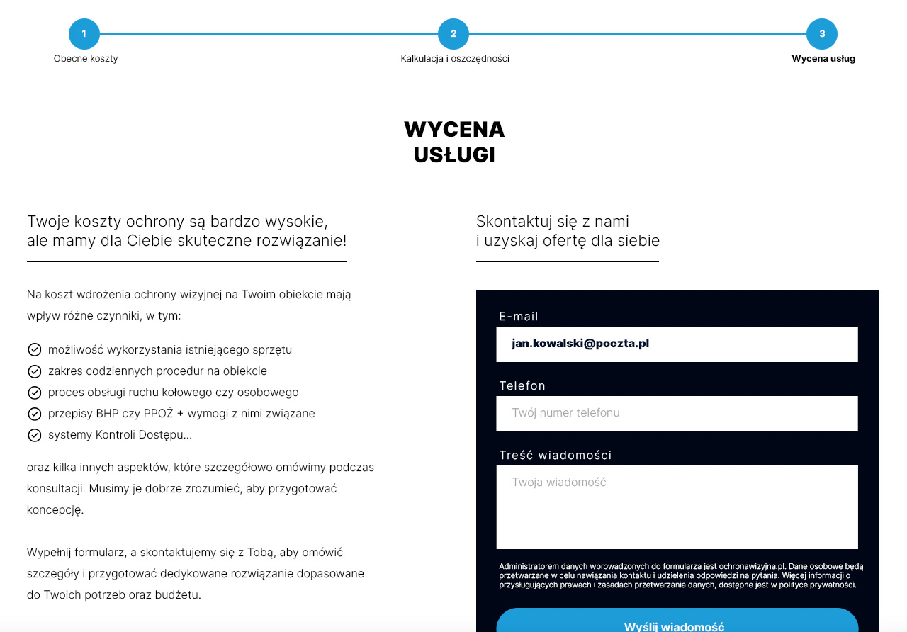 Przedstawiona kalkulacja nie stanowi oferty w rozumieniu przepisów prawa cywilnego. Ma ono na celu jedynie zaprezentowanie odbiorcy orientacyjnych rocznych kosztów ochrony oraz różnic wynikających z różnych sposobów jej świadczenia, wysokości potencjalnych oszczędności oraz pozyskanie informacji na temat przybliżonych kosztów realizacji opisywanej usługi.