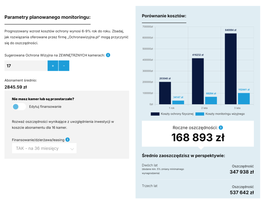 Poniżej przedstawiamy porównanie rocznych kosztów jakie nasz klient ponosił na ochronę fizyczną z kosztami monitoringu wizyjnego